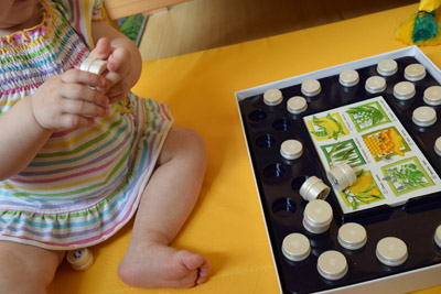 Мозаика. Можно баночки использовать в качестве строительного материала для плоскостных композиций: выкладывать геометрические фигуры, домики, цветочки и т.д. Как дополнение к сортировке неплохо: выложить в форме цветка все цветочные ароматы, например. Или все фруктовые в форме... банана! %)