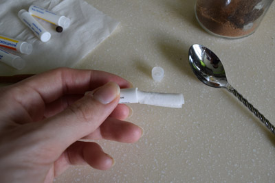 Теперь о том, чем наполнять. Идеально - эфирными маслами, причём можно самыми дешёвыми и синтетическими, главное, чтоб пахли понятно, мазаться ими или пить мы всё равно не будем. Технология: берём салфетку (можно и туалетную бумагу), отрезаем полоску шириной с высоту контейнера, смачиваем парой капель, скатываем в рулончик, который потом засовываем в тубу, затыкаем пробкой.