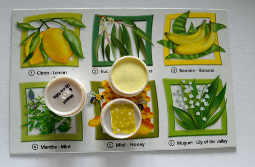 Набор запахов вызывает неоднозначную реакцию. (лимон, эвкалипт, клубника, мята, мёд, костёр, яблоко, флёр д'оранж (цветы апельсиного дерева), грибы, грейпфрут, банан, арбуз (НЕ дыня!), лаванда, ваниль, ландыш, печенье, фиалка, сосна, кокос, фенхель, лесной орех / фундук, цветок жимолости, абрикос, роза, мыло, апельсин, трава, ананас, море, черная смородина) С одной стороны - вполне понятные, узнаваемые и полезные для развития ароматы: ананас, банан, роза, грибы... С другой - редкие типа жимолости и флёр д'оранжа, или совсем непонятные "море" и "мыло". Два последних меня более всего смущают, ибо море у всех разные ассоциации вызывает, на мой вкус оно должно пахнуть солью, йодом, немного рыбой и водорослями, такой несильный солёно-едкий запашок. В лото море пахнет освежителем воздуха типа "Морской бриз" - сладковато-терпкая химия с ассоциациями о мужской парфюмерии. Не самый удачный стереотип, имхо. А мыло я не поняла, поскольку сейчас какое мыло-то продают? С запахом розы, лимона, фиалки, весенней травы, морской свежести... Сперва, я все фиалки-ландыши только так и идентифицировала, что мылом пахнут. А коли без ароматизаторов, то тогда "мыло" должно быть как хороший брусок 72% :)))) хозяйственное :)))) здешнее мыло по-французски пахнет цветочками, путает.