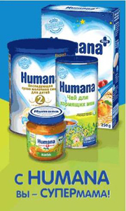 Детское питание Humana, компания Philips AVENT и компания «ОЛТРИ» объявляют о запуске новой федеральной акции «С Humana Вы – супермама!». Акция стартует 1 марта и продлится до 30 июня 2012 года. Приславший наибольшее количество логотипов Humana участник акции получит главный приз – сертификат номиналом 100 000 рублей на приобретение бытовой техники Philips.