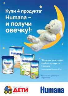 В сети магазинов Дети (Сант-Петербург) проходит акция от производителя органического питания из Германии Humana. При покупке 4 любых продуктов* вы получите в подарок овечку.
