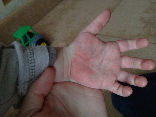У моих контактный дерматит у старшей на металлы (застежки джинсов, бюстгальтеров, бюжетерные сплавы украшений) и горчицу, у младшей на косметику (ту что не из аптеки, включа крем с зайчиком детский)                                        Может быть на все что угодно, от бытовой химии, до материала перчаток или коврового покрытийа (к дерматологу бы сходили)