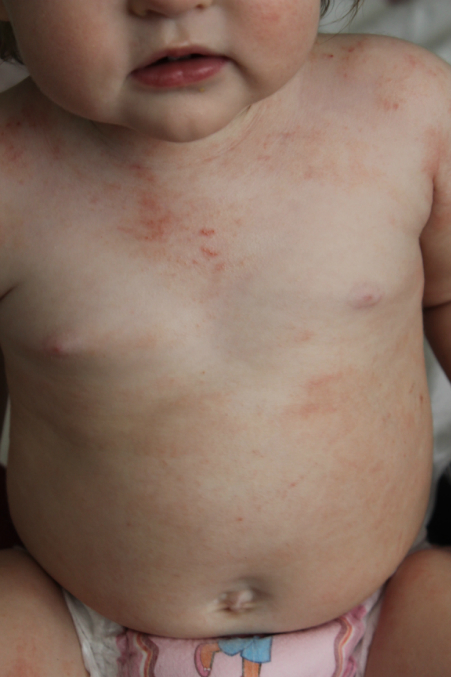 Вызвали врача - сказала дерматит. прописала хилак-форте для кишечника. зиртек от аллергии и элидел крем.