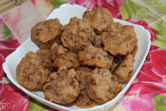 От компота остались яблоки,груши, я их размельчила, добавила к ним сахар, подсолн.масло, рисовую муку и муку пшеничную (у когод нет реакции), немного кипятка и пол ч.л. соли