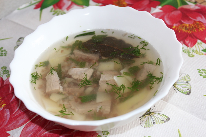 Отвариваем мясо на втором бульоне, добавляем картофель, гречку ( можно предварительно ее обжарить без масла 10мин), и варим 15мин