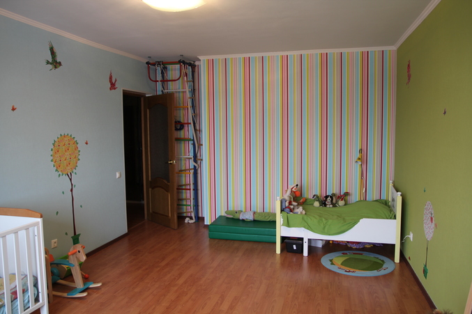 Очень уютно у Вас. А почему именно ламинат?И на кухню тоже,не расходится в швах если попадает вода?А в детские не расматривали пробку? В детских рисунок или обои такие здоровские?
