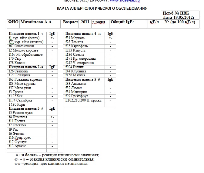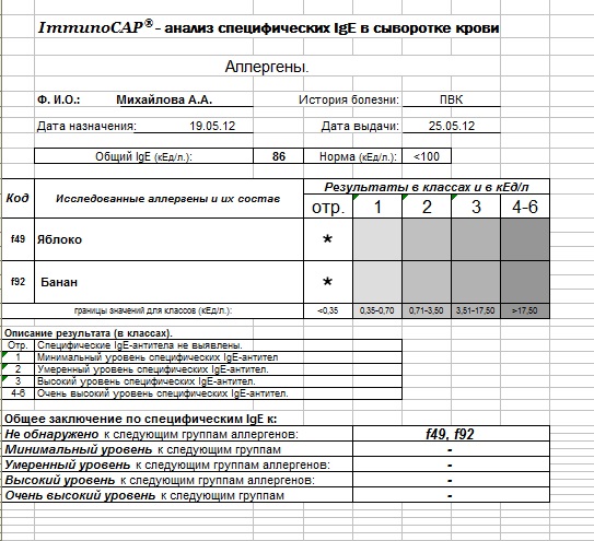 Он нас посмотрел, все спросил. Про прошлые анализы крови сказал, что все, что не ИммуноКап - это фигня. У нас год назад был анализ пищевая панель 40 аллергенов, но среди них не было яблока и банана - так вот именно ИХ нам тогда сделали отдельно и методом иммунокап, а 40 аллергенов, видимо, чем-то другим... Т.е. у нас на руках было 2 бумажки - панель с 40 продуктами и иммунокап с 2 продуктами (яблоком и бананом).. Вот так..