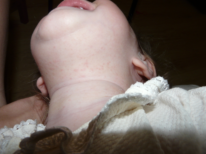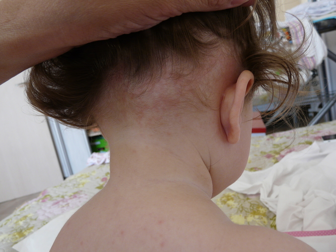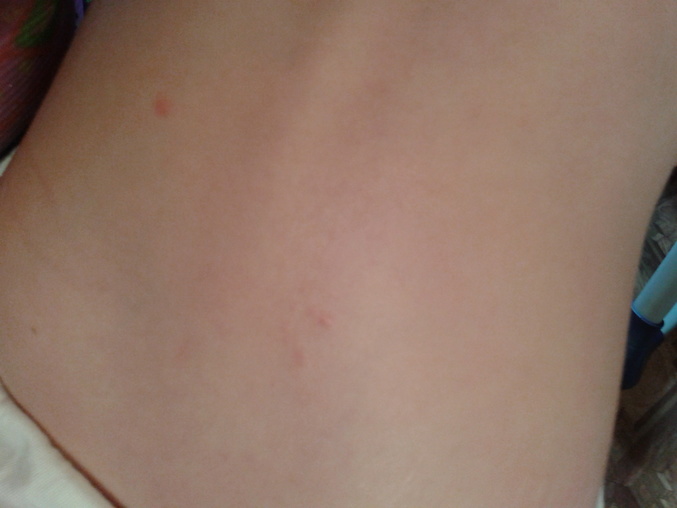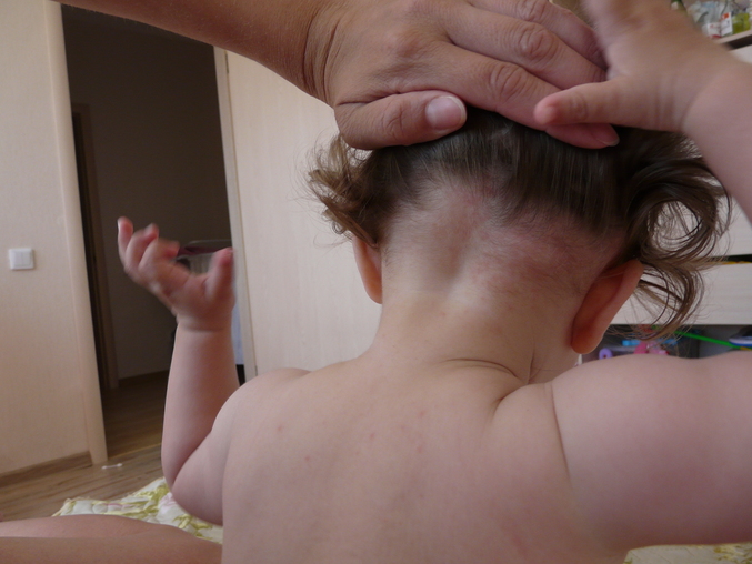 а две последних в волосах у нас был зуд и она расчесала... это на пищу ведь? а на спинке прыщики?
