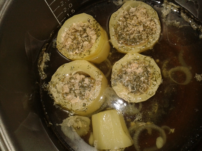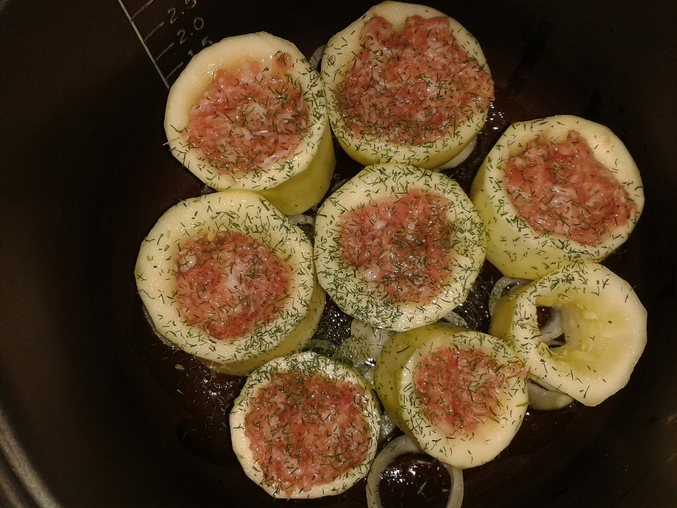 Чистим кабачки, режем примерно на 4 части поперек, вычищаем середину и замачиваем (я вымачиваю всегда ночь в подсоленной воде). Фарш, в нашем случае это был кролик, солим. В смазанную любым разрешенным растительным маслом чашу мультиварки на дно кладем порезанную кольцами головку лука (я порезала кольцами так как лук совсем не люблю, тем более вареный, он здесь больше для вкуса). Ставим наши стаканчики из кабачков и начиняем их фаршем. Посыпаем укропом, солим. Заливаем водой. Получилось вот что