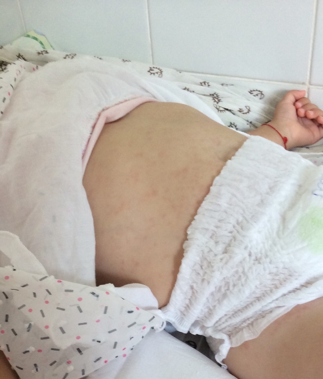 Свет я добавила фотку ,может не четко видно,это на животе .а на лице прям пятнышки ,сегодня она уже те края яркая.