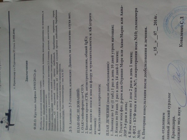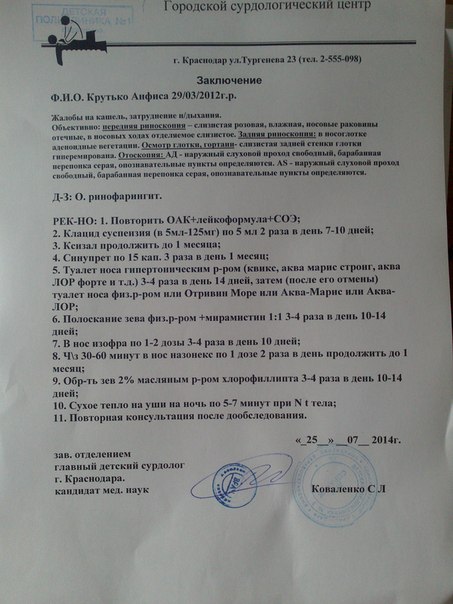 В тот момент был храп во сне, что-то с носом, но соплей не было. До сдачи анализов начались сопли. В день сдачи уже зеленые. Начала лечение назонексом, ксизалом только в день сдачи анализа. Активно промывая сопли стали светлыми, назонекс убрала на дня три из-за того, что их нельзя с бактериальной инфекцией (И НАЧАЛОСЬ УХУДШЕНИЕ - ЗЕЛЕНЬ ВЕРНУЛАСЬ). Позвонила ЛОРУ, она сказала если нет гнойных выделений НАЗОНЕКС ПРОДОЛЖАТЬ, тут же его вернула, подключила изофру (НИ РАЗУ не пользовались местными антибиотиками, только в мес 4 во время отита пили антибиотик), резко стало лучше. Сегодня поехали к ЛОРУ. Дз: острый ринофарингит