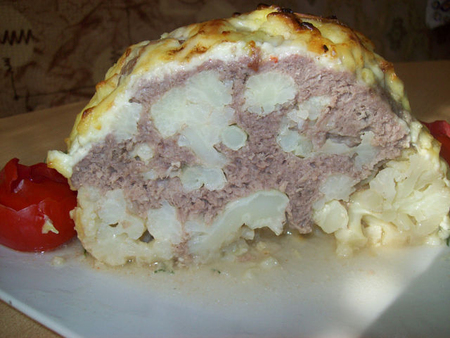 Отварить 5 минут капусту, охладить, немного обрезать внутренность капусты, в промежутки между соцветиями набить фарш, запечь в духовке под фольгой (я без делала, тоже норм) минут 40