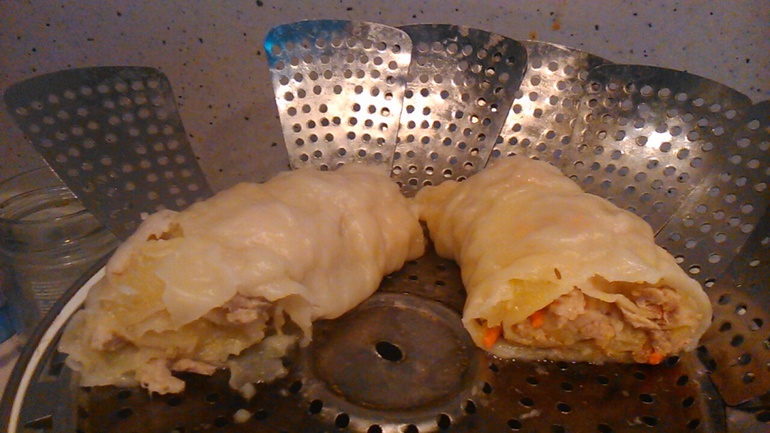 Тесто раскатываем небольшими лепешками, выкладываем начинку, заворачиваем в рулет, края защипываем как конфетку. И все это в пароварку минут на 30-40, наверно зависит от размера рулетика.