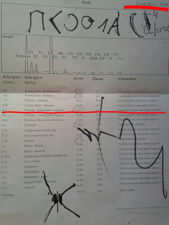 У нас то же самое. На днях сдали анализы в фидес-лаб имунокапом — на кошку все по нулям. В феврале сдавали у Смолкина на кошку был 1 класс и по прикам было +. У нас дома 2 кота. Проявлялась аллергия только кожно. С пылью — аналогичная ситуация. Может анализы левые? Зимой поедем к Смолкину — повторим кошку и пыль. Была еще аллергия на рожь и яйцо 2 класс — сейчас стал 1. По яйцам нарушали частенько, по ржи — исключали с февраля
