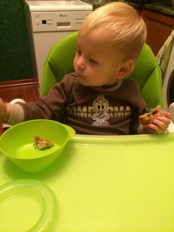 Прямо в блендер с 200 гр пюре добавила 2 ложки растительного масла, 4 больших столовых ложки цельно зерновой муки, в той же чаше перемешала и выложила в форму. Сидит, полдничает :)