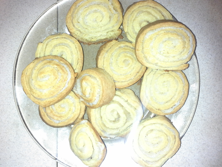 Растопить сливочное масло до жидкого состояния, добавить сахар и 2-3 ложки муки, смешать. Тесто раскатать в тонкий пласт, распределить поверху сахарно-масляную смесь и свернуть все в рулет. Нарезать рулет на небольшие кусочки и положить на противень, застеленный пергаментом. Выпекать при небольшой температуре, пока не подрумянятся ( если огонь будет сильным, масло может подгореть). Все. Вот что получилось у меня.