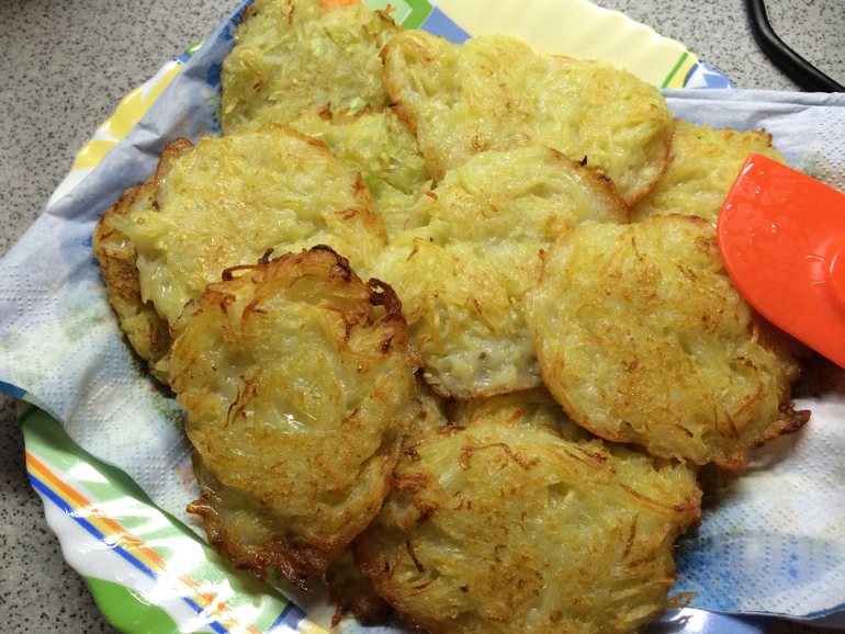 Картошка, кабачок,лук репчатый, б/к капуста, соль, перец, рисовая мука. Все на глаз, как обычно. Все перемешиваю, и ложечкой выкладываю на разогретую сковороду, смазанную маслом. Я жарю в мульте, при закрытой крышке одну сторону минут 7, с другой стороны жарю при открытой крышке. Очень вкусно! Мои пацаны, которые едят больше чем я на гв, без ума от них.