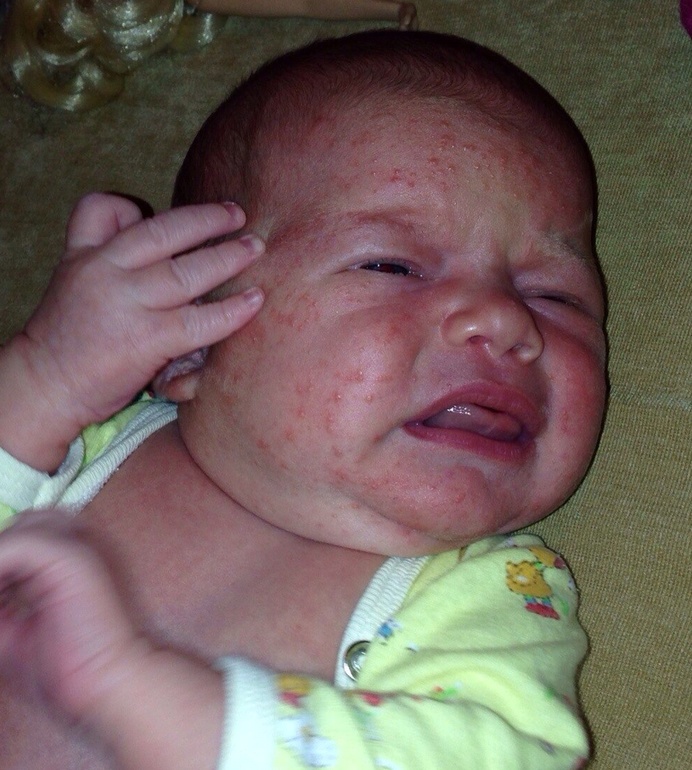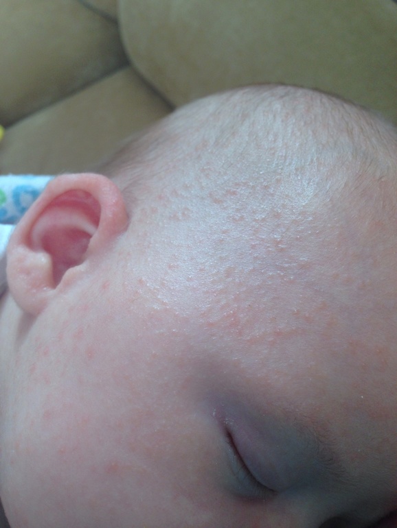 Кожные проявления АЗ Казалось уж со вторым аллергиком буду с лету понимать аллергия или нет, но все равно сомнения меня мучают. Вобщем как и с первой все началось в три недели. Хотя с рождения но молоко, ни яйцо ни рыбу и т д и тп не ем. Наш аллерголог говорит что у нас больше сильное акне, так сильно проявившееся из за желтушки и нашей предрасположенности к аллергии.плбс еще и потница.да и лактазная недостаточность может поддерживать сыпь. Прыщи то есть то нет, тут вообще все прошло. Три дня опять начало сыпать и опять вся голова в этих мелких мелких прыщиках, в некоторых белые головки, сыпь какая то в цвет кожи, естественно краснеет после плача. Гляньте, может у кого была такая сыпь при аллергии? На первом фото нам как раз три недели и первый день "красоты", про это состояние аллерголог и говорит что акне.