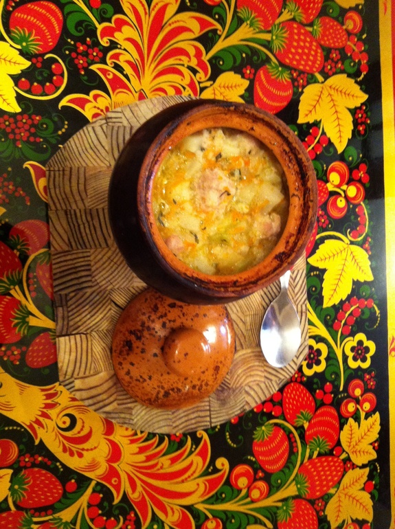 Кладем все, что Вам можно ( я предварительно пассирую овощи, а фрикадельки отвариваю в воде) в горшочек , подливаю воды до краев, солю и в духовку на час. Готово!!!