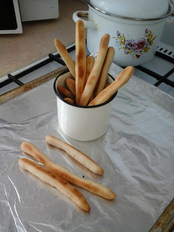 Дочка спит и еще не знает что я для нее приготовила "лакомство". Как доктор сказал кормить , значит будем кормить, но только своим. Ничего лишнего, стакан муки, 1 перепелиное яйцо, вода, 1 ст.л.подсолнечного масла. При темп.170 гр.,выпекалось 20 мин, периодически переворачивала. Будем пробовать. Хоть у нас и нет аллергии на муку и яйца, я все же больше 4 мес ее не кормила ни хлебом ни прочим чем то. Надеюсь дочери понравится. Все в меру конечно, по одной палочки 2-3 раза в день)