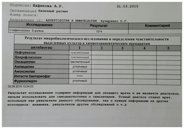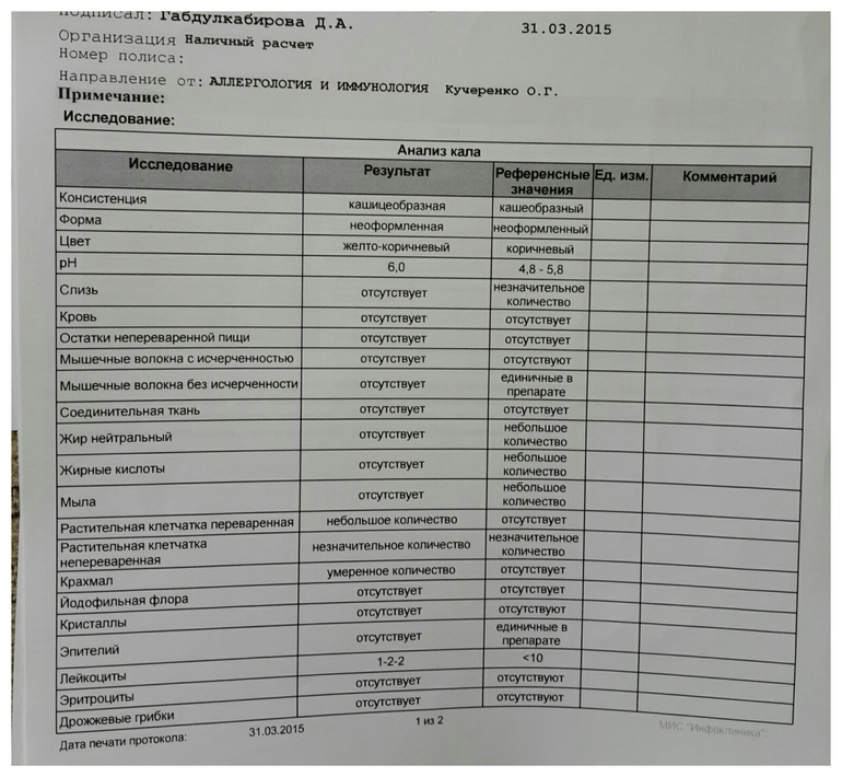 Врач сказала, что пища это обострение принесла , возможно, из-за ферментной младенческой недостаточности кишечника. Спровоцировать могло все. Питание мамы тоже сыграло роль. Сказала "аллергии на все быть не может. А то что вы рассказываете говорит о срыве кишечника. Это он не справляется. Потому что есть патогенная флора, которая подавила полезную именно при сопутствующих обстоятельствах, создаваемая в том числе и питанием". Как-то так. Предложила сначала добиться очищения кожи. Т.е. "Лечим сначала вторичную стадию заболевания и не даем ребенку страдать от чесотки. Соблюдаем жесткую диету. Используем эмолент в купании и на кожу. Мажем обязательно пораженные участки кожи кремом с антибактериальным и противогрибковым эффектом (грибок есть у всех , а у нас сейчас в стадии обострения) с антибиотиком, и добиваемся стойкой ремиссии. Мама ест только три вида продукта:гречку, цв.капусту и индейку отварную. Ребенок также. Пока пьет антигистаминные препараты едим так неделю и потом когда очистится кожа тоже неделю, понаблюдать пищевая ли аллергия это! ? Если кожа не зацветет,то вводим следующий продукт". Про линейку на аллергены не заикался. Но сказала сдать анализы кала на дисбактериоз, капрологию. Мы сдали все. Гляньте результаты: