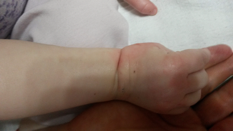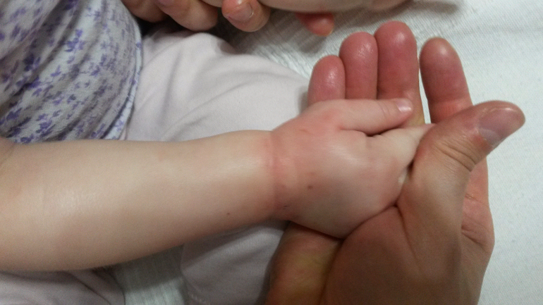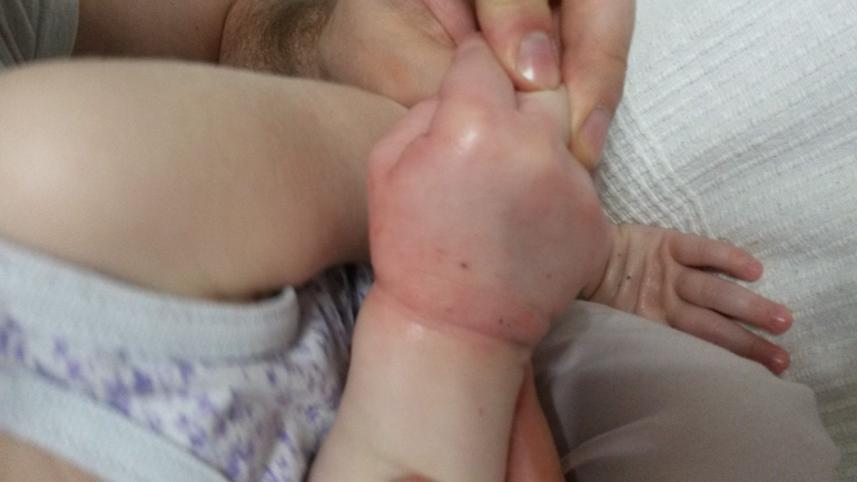 На улице ходили в перчатках даже в теплую погоду, ручки мыло раньше шампунем эмолиум и мазала эмульсией для тела, но когда спал, она видимо пощипывает.