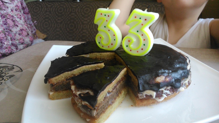 Тортик конечно корявый (собирался под крики младшенького), но вполне вкусный! Итак, коржи по бессмертному рецепту сообщества "кабачковое пюре-рисовая мука-растительное масло-разрыхлитнль ", в один для цвета добавила чернику. Пропитала финиками взблендеренными и ванильной мастикой Парфэ (состав вполне приличный), можно и без нее обойтись, можно самой сделать как глазурь из сахарной пудры. Сверху глазурь из короба и маргарина (я подумала что раз в жизни можно): кэроб развела водой немножко, нагрела, добавила маргарин и немного агара (я кондитер неопытный, а с маргарином вообще первый раз имею дел,, поэтому чтобы застыло наверняка использую агар). Ну и все собственно. Теперь вот мне старший сын целый день свечи задувает)))