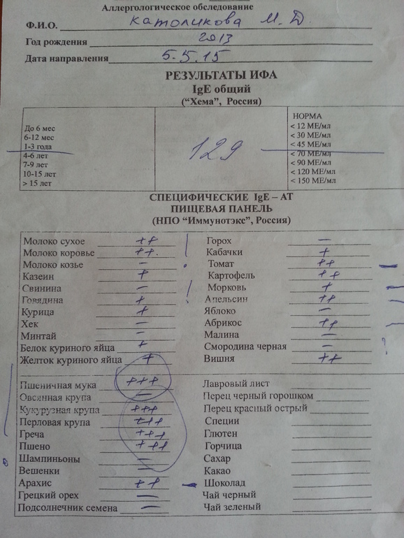 в феврале осыпало снова и сильно, не проходило, 2 мес справлялись сами, в апреле опять пошли к врачу, так же случилась сильная крапивница ни с того ни с сего... отправили сдавать еще раз IgE-129! до года 4 раза сдевали - 19 было.