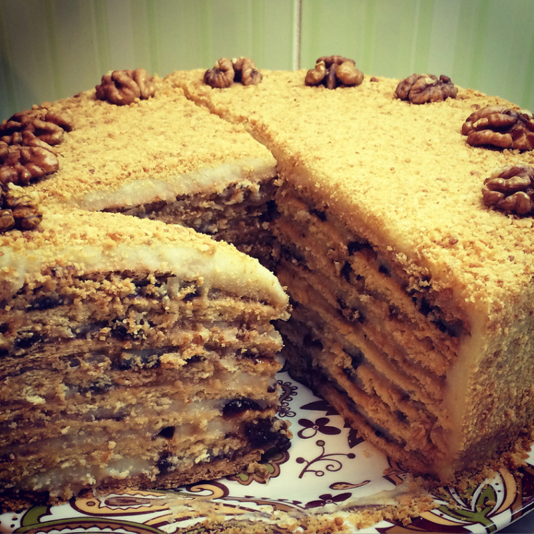 ТОРТ МЕДОВИК БЕЗ ЯИЦ И МОЖНО БЕЗ МЕДА ))): Масло сливочное 100гр, Сахар 2/3 стакана, Мед (патока или кленовый сироп), мука пшеничная 2,5-3 стакана. Сметана 300гр. Сода гашенная 1,5 чайные ложки. Думаю что вместо сметаны можно будет и на других молочных продуктах приготовить, например из домашнего йогурта из эвиталии. На водяной бане растопить сливочное масло, когда растает, добавить сахар и мед. Сюда же добавить сметану и постепенно вмешать 1 стакан муки. Добавить погашенную соду и снять с бани. И дать остыть минут 5. После этого вмешать оставшуюся муку. Муки может понадобиться от 2,5 до 3,5 стаканов. (я последний раз положила всего три стакана, т.к. при 3,5 ст в предыдущий раз раскатать тесто резиновые было ооочень сложно) Следите, чтобы тесто оставалось мягким и эластичным. Если муки будет слишком много - будет сложно раскатывать. Разделить тесто на 6 равных частей, завернуть каждую в пищевую пленку и убрать в холодильник минут на 15-20. После того, как тесто остыло, раскатать каждый кусок на пергаменте (фольге) и вырезать по форме. Коржи будут очень тонкие. Нужно наколоть вилкой, чтобы не было пузырей. Последний корж пойдет на крошку, так что его можно не вырезать. Но мне хватало и обрезков от последнего коржа на обсыпку если очень мелко растолочь. Выпекать каждый корж в разогретой до 180-200 градусов духовке примерно 3-6 минут. Горячие коржи очень мягкие, поэтому важно положить их остывать на ровную поверхность. Снимать с пергамента можно минут через 5. Последний корж (или обрезки) раскатать скалкой или измельчить блендером в крошку. Смазать кремом коржи. Мне понравилось между коржей еще добавлять мелко нарезанные сухофрукты курагу+чернослив, курагу, или изюм черный. Ну а орехи грецкие нам нельзя но ооочень напрашиваются они в этот тортик )))). Обсыпать сверху крошкой или покрыть мастикой и т.п. поставить пропитываться часа на два. Поскольку коржи мягкие, пропитывается торт быстро и получается очень мягким.