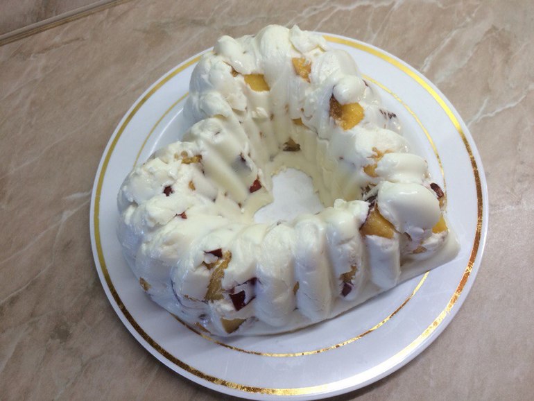 А еще такую сметано-творожную смесь на желатине с фруктами делаем, в данном случае с персиками-нектаринами: