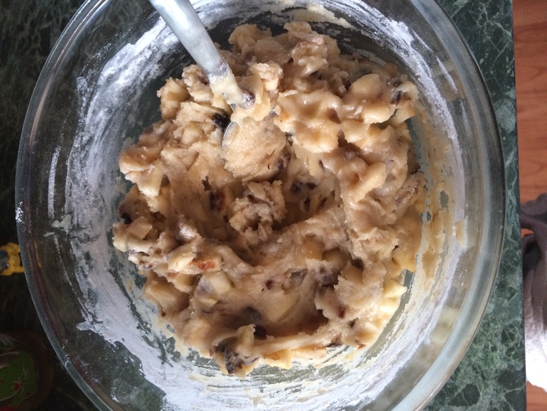 Потом ниже прочитала про банан))) Одни печенья у меня были только с грушей: я сначала смешала масло, сахар, соль, соду и грушу без кожуры блендером, а потом всыпала рис.муку и размешала все ложкой. Получилась густая масса. Выпекалось все отлично!