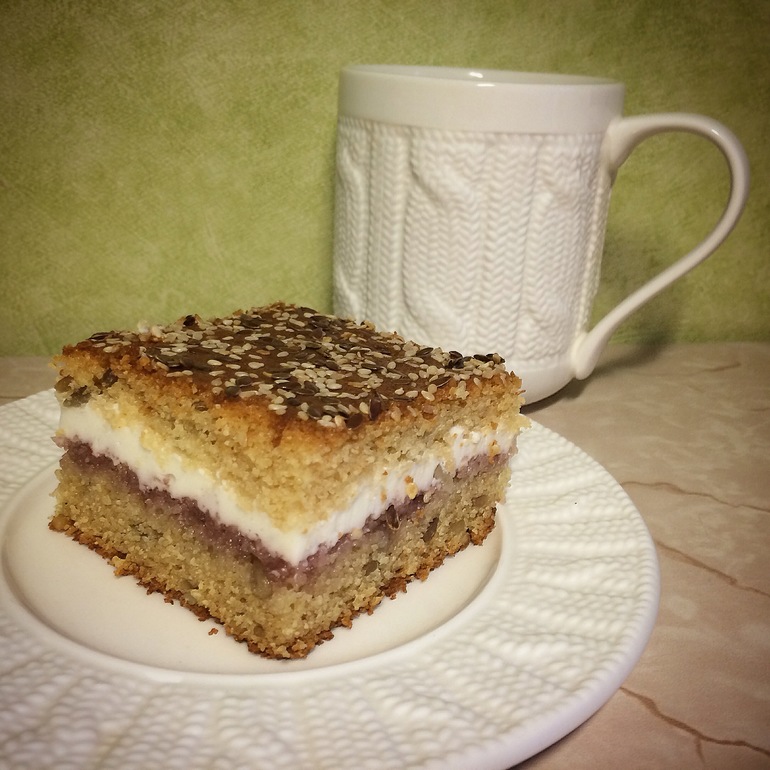 Наша КУЛИНАРНАЯ КНИГАС творожно-сметанной прослойкой (на желатине), пропитанный малиновым вареньем, с семенами подсолнечника в тесте, усыпанный семенами льна и кунжутом.
