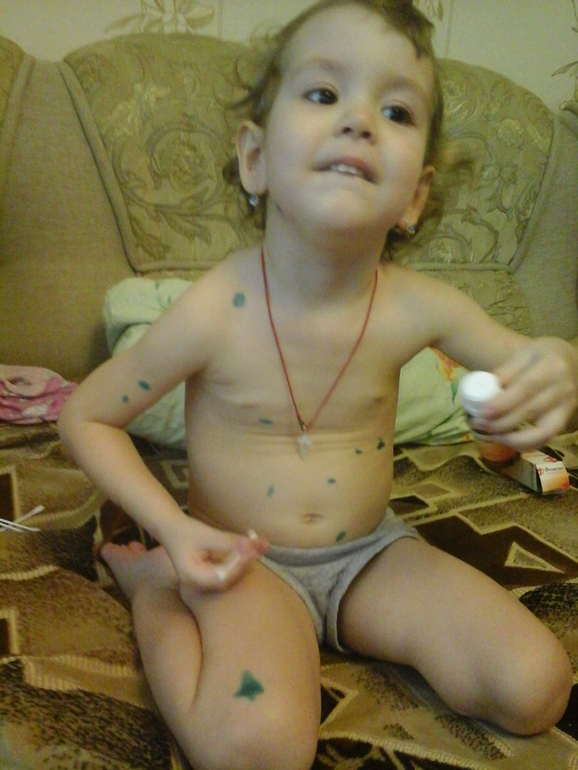 Болталкаутро н ачалось с зеленки!!!! Сперва заметила как ладошку чешет, смотрю, пузырек водяной....потом еще и еще, спинка, животик покрылись в течения дня, но не сильно, ттт. Слежу, мажу зеленкой. До этого 2 дня кашель шел и сопли, темп.небыло и нет. Даю весь день арбидол и фенистил, на ночь дам энтеросгель. Надеюсь пройдет все в легкой форме. Локти конечно покраснели силтнее обычного, чешет иногда.
