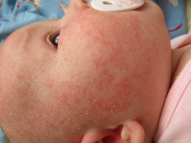 Щеки и лоб в мелкой сыпе и шелушатся:
