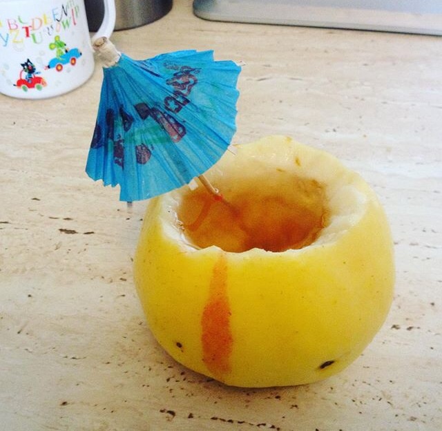 Берем яблочко, вырезаем сердцевину и наливаем компот/морс/кисель. Украшаем, например, зонтиком))