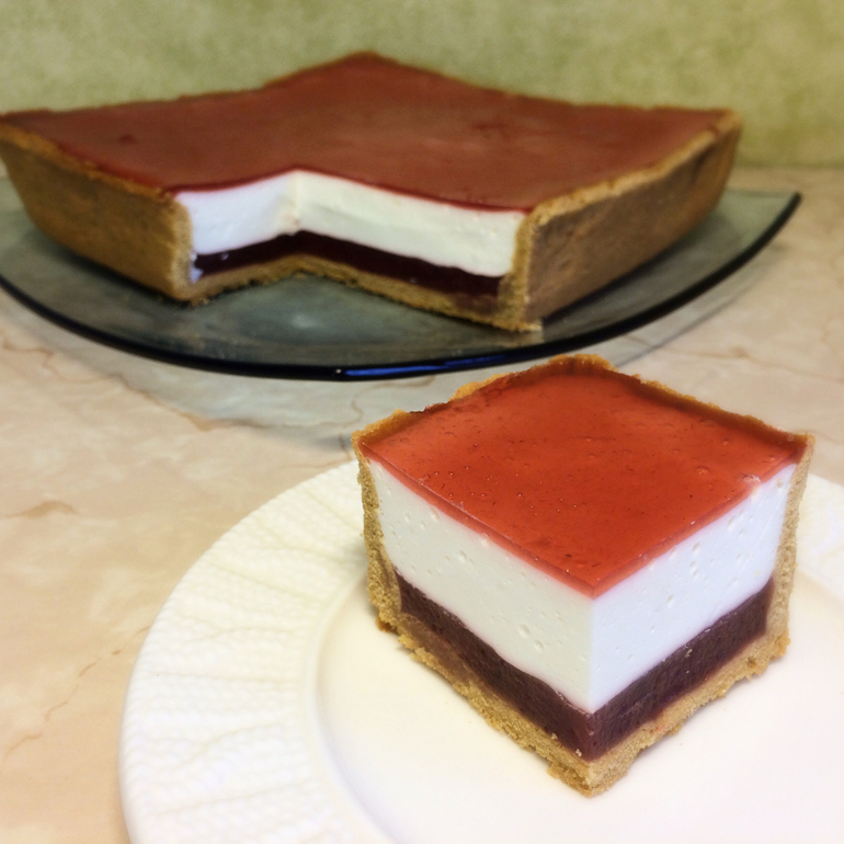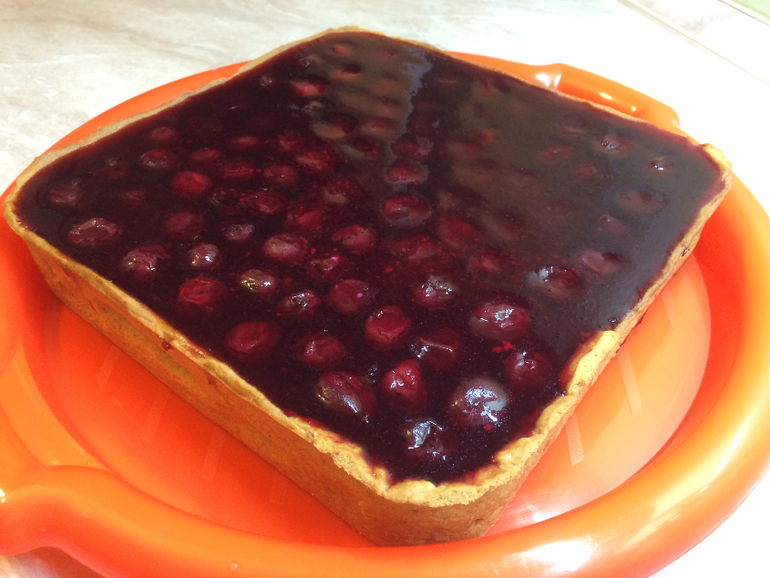 Тоже на заказ. Вишневый.... Говорят что вкусный, но достался не нам ) песочная кукурузно-пшеничная основа, творожное суфле с вишней, и мармелад с вишней. Вишни на такой ушло 800 гр. замороженной.