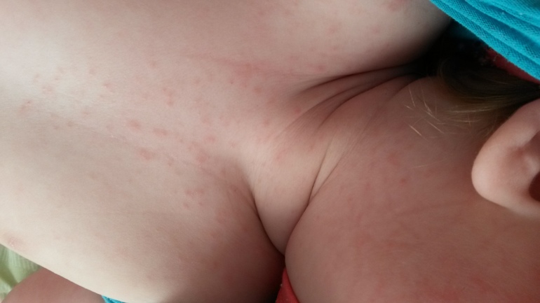 Сегодня температуры уже нет, именно на шее похоже на потницу, но такая же сыпь по всей спине... немного на ногах, на лице просто красные пятна... вряд ли это потница. Утром заменила ей зиннат суспензию на таблетки... думала может на ароматизатор в суспензии..нет....к обеду пятна усились( Вечером боюсь давать..