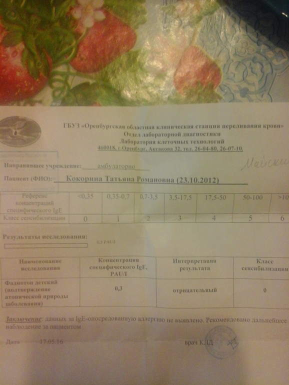 Фадиатоп детский (ImmunoCAP), его много где делают, у нас он тоже ничего не показал , и зав. отделением сказала (вообще она доверяет только кожным пробам), что отрицательный результат по крови даёт лишь надежду, что аллергия пройдёт, но я уже в это не верю, т.к. у нас она меняет форму
