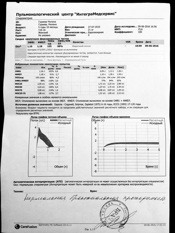 Насть, вот сразу тебе говорю: фвд без пробы (т.е. без применения бронхорасширяющего лекарства) нефига не показательна. Точнее не так. Многие врачи считают, что показательна. Т.е. вот полцчили они какие то хорошие, в пределах нормы результаты, и говорят "нет у вас астмы. Своболны". Но лавр так не считает. Он гьворит, что надо обязательно делать фвд с пробой. Т.е . Сначала подышали в трубку без применения лекарств. Сняли показания. Потом проингалировались вентолином (или аналогом) и через 20 минут (после того как леуарство подействовало) сделали еще одну серию измерений. И вот тогда уже видно квк бронхи реагируют на бронхорасширяющий препарат. Если разница в объеме более 10 процентов, то можно говорить о спазме (воспалении/астме и т.п). Если же бронхи не реагируют на препарат и не расширяются сильно, то об астме мы пока не думаем. Роме моему фвд без пробы тоже делали. И все там у него было в норме. И аллерголог местный меня уверяла, что нет у него ничего. Но я, наученная лавром, буквально заставила ее сделать с пробой. Она сделала и сама охренела. У него прсле лекарства объем бронхоы увеличился на 25%. Теперь она делает мне фвд с пробой при каждом моем посещении. П.п.с. ты у лавра бы сделала фвд. Все таки он очень дотошно ее делает. Я сравнивала с тремя другими (ромиными и своими ) врачами.