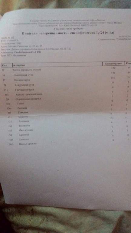 А по IgG4 белок коровьего молока, пшеничная мука, яйцо, овальбумин 4+