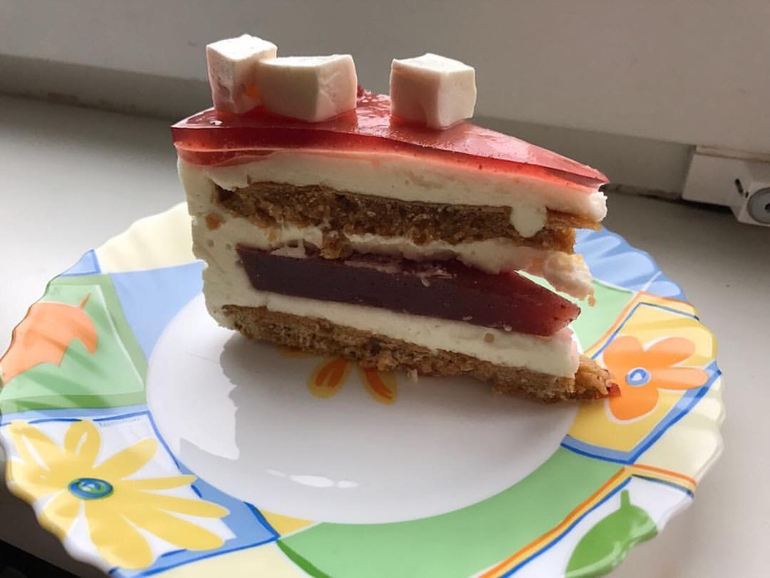 Вот, например, состав безмолочного и безяичного (возможно и безглютенового): сахар, желатин, вишня, агар-агар, любая разрешенная ягода или фрукт, пшеничная мука, масло растительное, ваниль натуральная, крахмал кукурузный/картофельный.