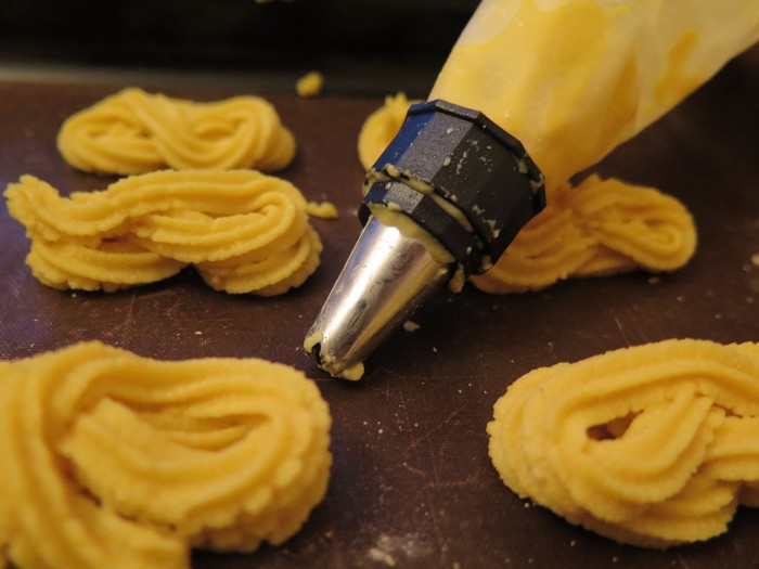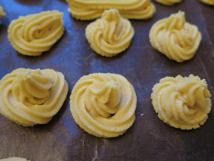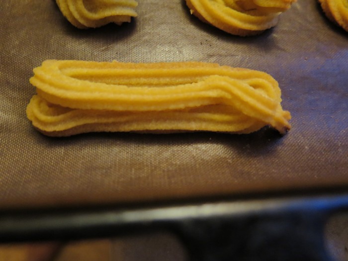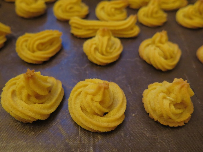 Получилось! Снаружи чуть хрустящие, внутри мягкие. Учитывая склонность теста превращаться в жесткое, старалась выдавливать потолще. Вытащила из духовки чуть подрумяненными.
