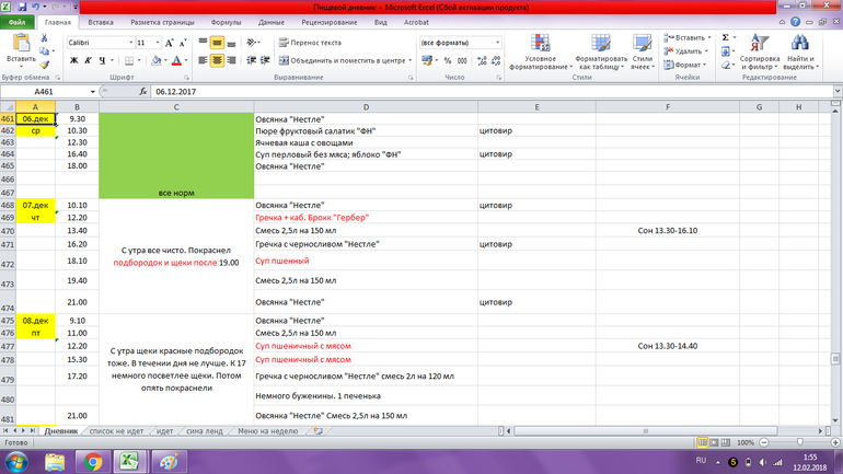 Пробовала и писать в блокнотик и в вордовском документе по дням, все ну удобно, придумала форму в экселе и начала записывать время приема пищи и время когда появлялись какие либо реакции. Очень удобная форма мне кажется. Когда болеет или какие то расстройства ЖКТ, добавляю столбики и в них тоже пишу какие лекарства даю или какой стул был. Вообщем в форме таблицы наглядно выходит, так же можно выделять цветом что либо.