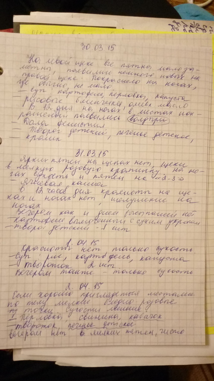 Я ела со старшей, отдала их девочке - у нее дочка тоже атопик. В обычной тетрадке писала число, а дальше завтрак, обед и ужин и перекусы и в ложках или граммах записывала, что мы ели, состав и фирму. У нас была истинная и накопительная аллергия. Дневник очень мне помог.