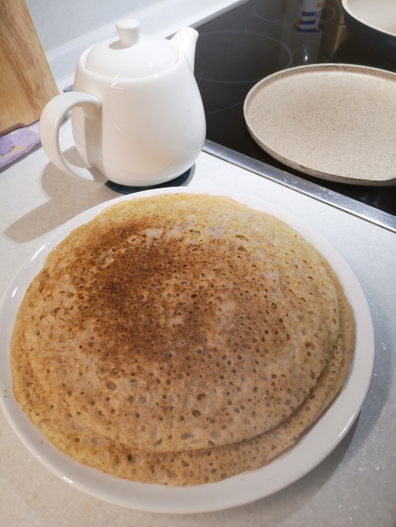Всё смешать (удобно в блендере) , последним добавить соду и кипяток. Жарить на сковороде, смазанной кокосовым/подсолнечным маслом. Готовые блины накрывать крышкой.
