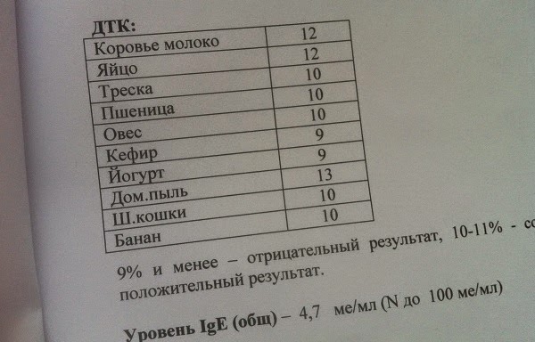 Вот результаты нашего обследования. Итак, нам нельзя коровье молоко, яйца, нужно выгнать из дома кота Григория и строго контролировать популяцию клещей в матрасах. Точнее, Льву можно, в общем-то, всё, Варе - ничего нельзя.9% и менее - отрицательный результат