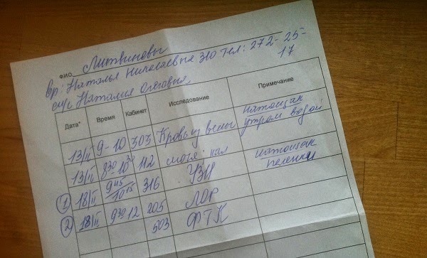 В 11:50 мы опять были в кабинете №312, где нам в бланк должны были перенести все назначения и сформировать график. Дело это не быстрое, поэтому мы попросили на 10 минут отлучиться на 5-й этаж и сделать ФТК (это когда надевают очки и "загораешь" секунд 6 с увеличением продолжительности).