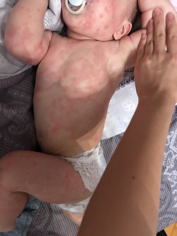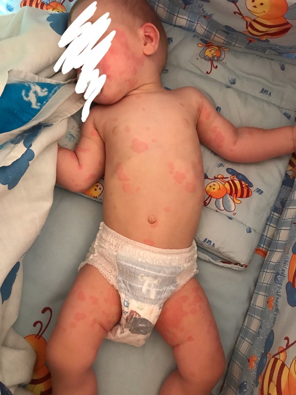 Аллергия не приговор. Делимся успехами.Девочки, посмотрите пожалуйста фотографии. Это могла так проявится аллергия? Ребенку 10 месяцев, съел 3 клубники. Ругаю себя ужасно, но он так требовал, что не удержалась дала. До этого по. Одной штучке но был все хорошо. На следующий день обсыпало. Под подозрением только клубника. Остальное все давно кушает и ничего аллергенного не добавляли в рацион. Вчера утром получается появились эти пятна, я дала 5 капель зиртека и намазала фенистилом, после обеда стало намного лучше. А сегодня утром опять все вернулось и даже хуже. Опять далека зиртек и энтеросгель. Пятна вроде побледнели, но стали сильнее расползаться по телу. Прилагаю фотки. 1-я это утро и где сильнее сыпь это сейчас. В остальном ребёнок себя хорошо чувствует, они не чешутся, не беспокоят. Кашля нет. Но я все равно переживаю, начиталась про отек квинке.... Проблема в том, что сегодня воскресенье, а завтра если мы только запишемся к врачу не понятно когда попадём. Стоит ли паниковать и вызывать скорую? И как считаете, лечение адекватное? Просто меры то какие-то все равно надо предпринять пока к врачу на пропадём.Нам просто раньше назначала такое педиатр, но тогда была ерунда, просто сухие пятна, а сейчас ужас..