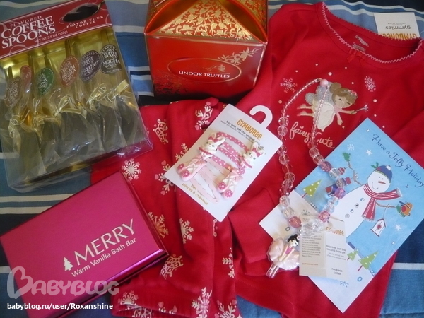 Я сначала хотела положить коробку под елочку, но не смогла. Нервы сдали:) Подарки подобраны с такой душой и вниманием! Обалденно пахучее мыло, весит наверное целое кило, красота! Маруся- балерина нацепила все заколки сразу, одела бусы и выплясывала целый час. Пижама Джимбори нашего любимого красного цвета, да еще и с балериной:) Конфеты разлетелись со скоростью света, шоколадные ложки облизываем и так, без кофе, вкусняшка. И открытка с теплыми пожеланиями и поздравлениями. Так приятно!