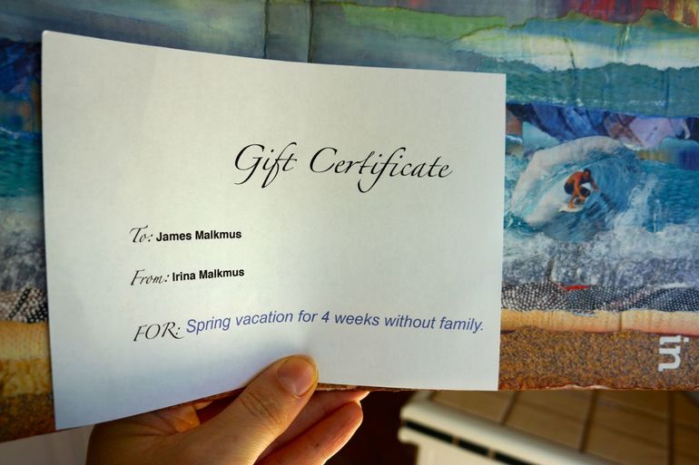 Круто! Ружье — это супер, но мне кажется, мой муж захотел бы выбрать себе сам, а вот 4 недели отпуска я бы купила без проблем в Колорадо и угадала бы! Только как вот купить, чтобы оставалось секретом? Налички у меня столько нет, а в credit or debit card statements все видно будет :) Ирина, а у тебя есть няня или ты сама так ловко справляешься с тремя?